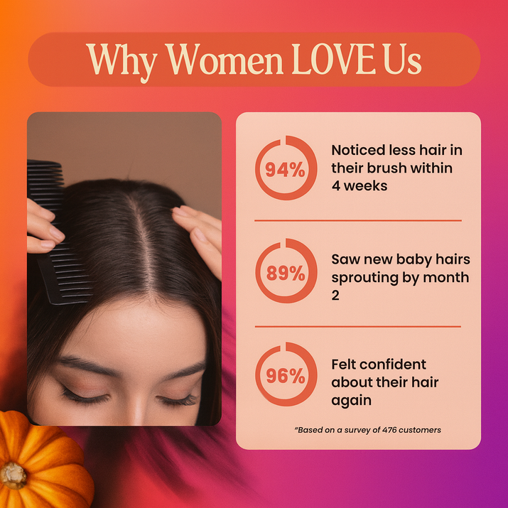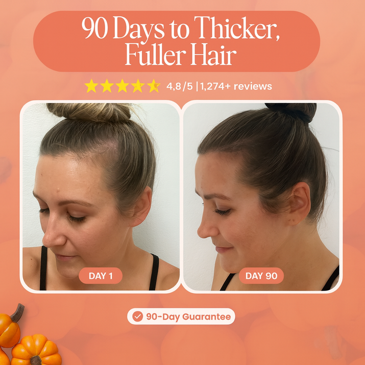 Our Pumpkinroot Pumpkin Seed Oil Capsules are made with ingredients backed by research to support healthy DHT levels. Since excess DHT is linked to thinning hair, this blend is designed to help. Packed with zinc, omega-6 fatty acids, and natural antioxidants, it works to nourish the scalp, minimize shedding, and encourage regrowth over time.