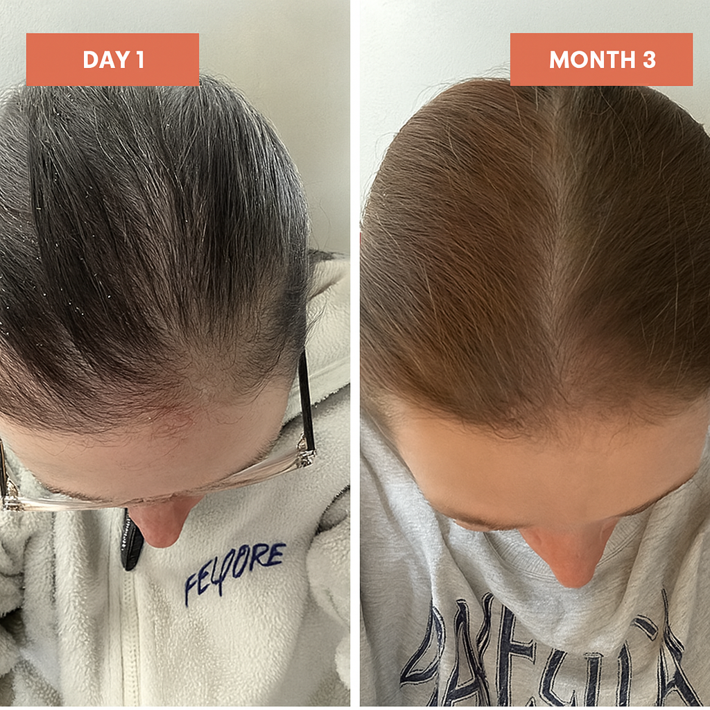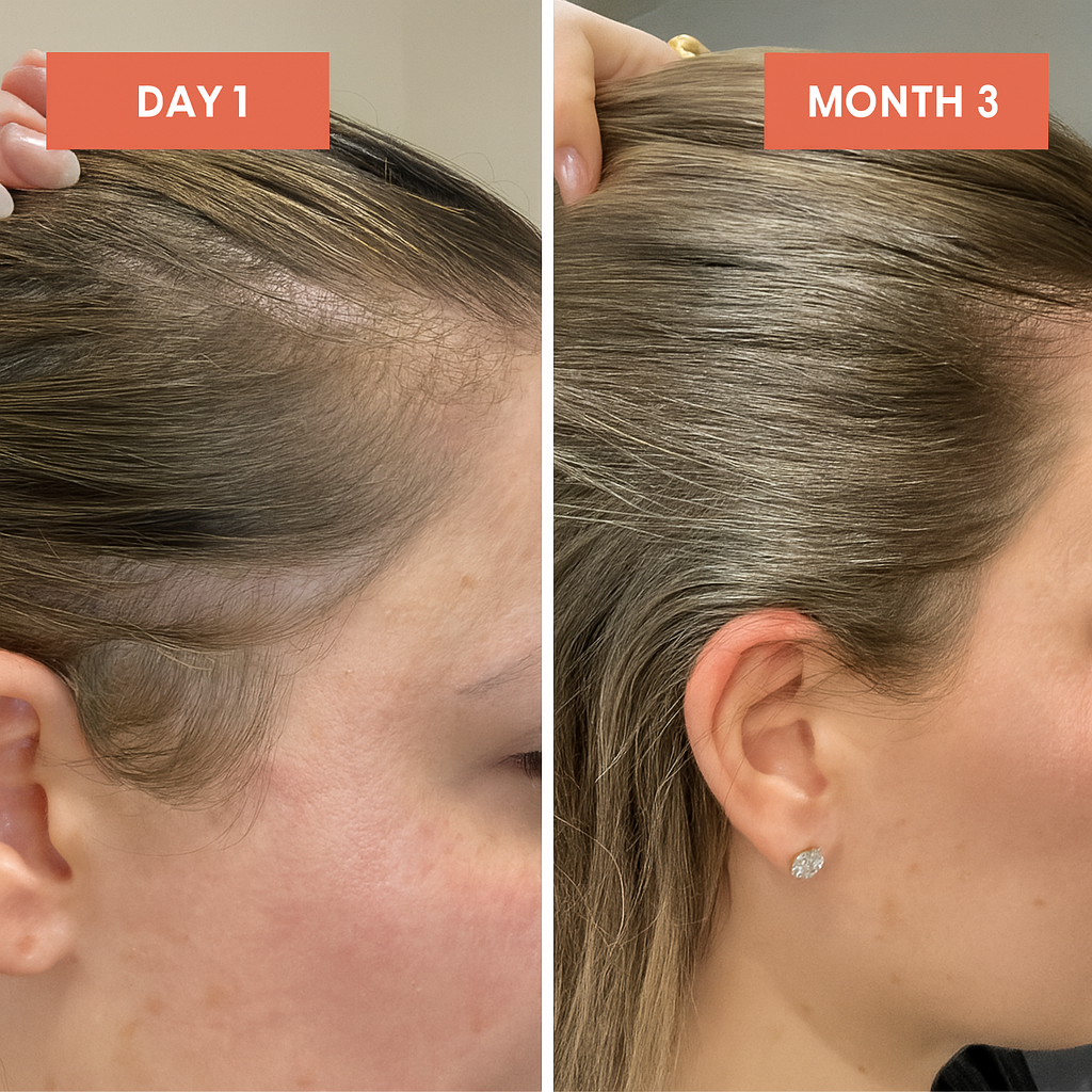Most users begin noticing less shedding within 2–4 weeks of consistent use. Early new growth usually appears around months 2–3, with the most visible changes in thinning areas happening after 4+ months of daily use. Hair growth is gradual, so timelines can vary from person to person.